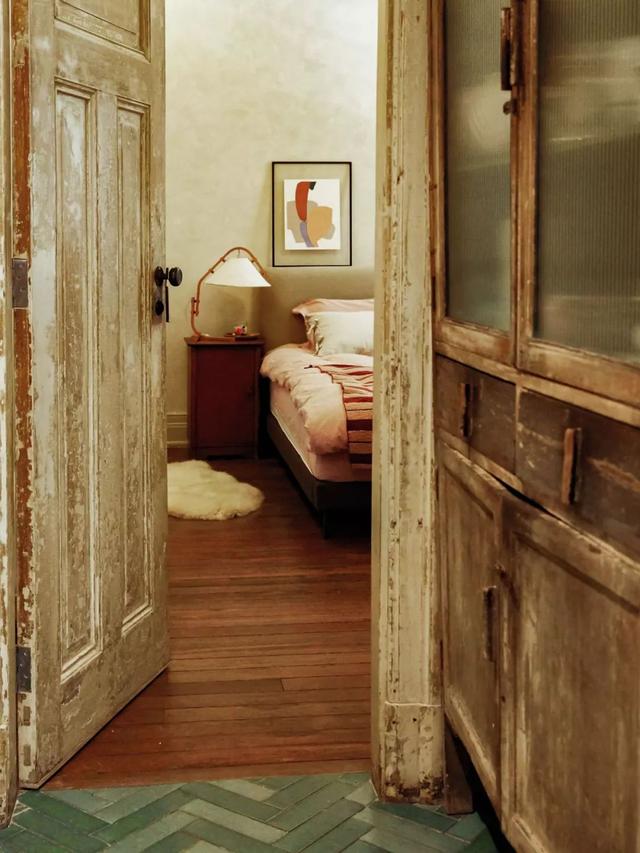房间里所有的门,都是原本房子留下来的门的再利用。门本身形态很美,于是专门找工匠进行了5次反复的脱漆打磨,重现它斑驳的原始质感。