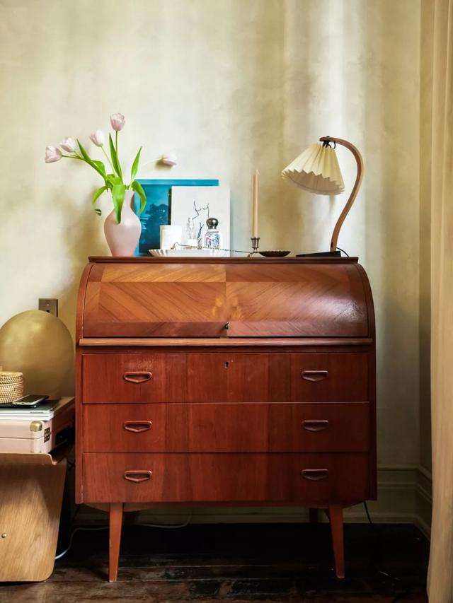 房间的秘书柜选的也是一个有弧度的,它是60年代的瑞典设计家具。当时我看了很多秘书柜,但大部分都是方形的,后来很难得找到圆弧形的这种秘书柜,有一种别致的柔和感。